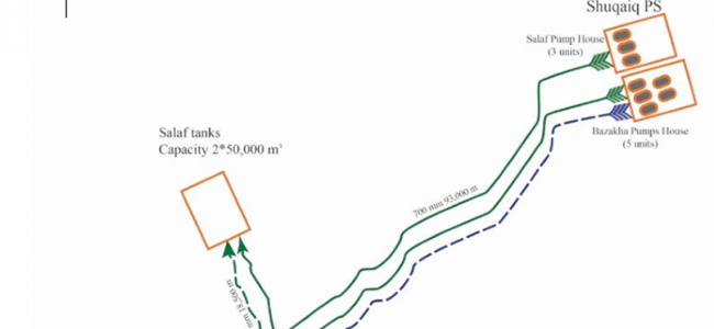 Main transmission pipeline from Shuqaiq pump station to Bazakha tank with total length of (110) km and diameter of (900) mm from steel.